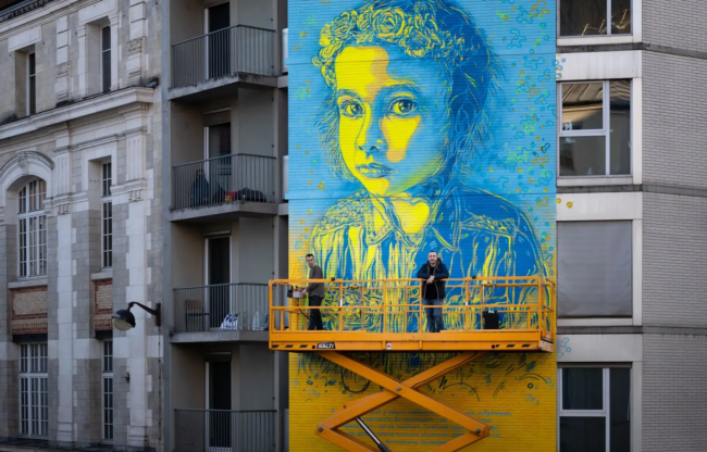 Peu de temps après l’agression russe, le 24 février 2022, C215 peint une première grande fresque aux tons jaunes et bleus sur la façade d’un immeuble parisien.