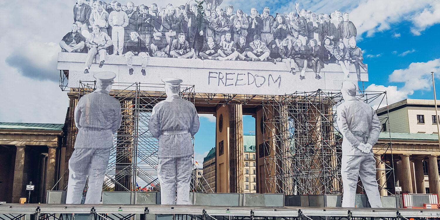 Pour célébrer l’anniversaire de la réunification de l’Allemagne en 1990 (28 ans), l’artiste français JR, vainqueur de l’appel d’offre lancé par la mairie de Berlin, a inauguré sa nouvelle installation géante de 25m de hauteur autour de la porte de Brandebourg, symbole de la chute du mur de Berlin.